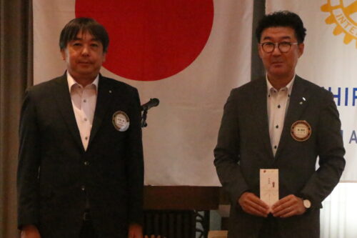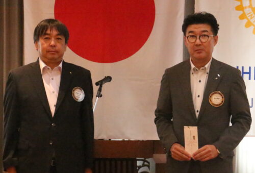 2022-23年度久木ガバナーより、板倉会員に出席優秀会員40年ということで年功バッチが届いております。本日ご欠席のようですので、後日お渡ししたいと思います。もう1点、2022-23年度、クラブ会員維持率100%ということで、会員増強拡大賞をいただいておりますので、お知らせいたします。