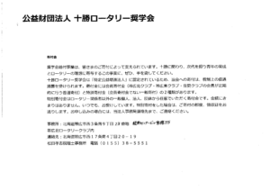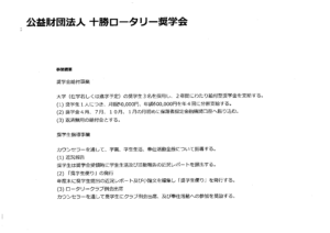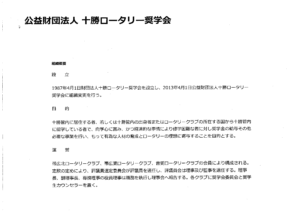 1987年4月1日財団法人十勝ロータリー奨学会として設立されました。その後、2013年4月1日に奨学会の性質上、国の方から指導いただきまして公益財団法人2013年に変更したという経緯がございます。目的の中で、その他の必要な事業を行いとするということについて話をさせていただくと、NHKのドキュメンタリー ドラマを見ておりましたら、高校生の携帯所持率が92%であり、8%の高校生は携帯電話を所持できない事情があり、そのことがいじめ問題に繋がっているということを放送されておりました。状況の改善のために各種の支援団体が乗り出して、その子供たちに携帯電話を支給し、利用料金も負担するような動きが、今起きております。やはり、 時代に新しい問題が生まれてくれば、奉仕を旨とする団体として、その他必要な事業を行うということも今後のテーマとして考えていかなければいけないんじゃないかと個人的にも思いましたし、理事会の席でも皆さんにお話をさせていただきたいと思っています。