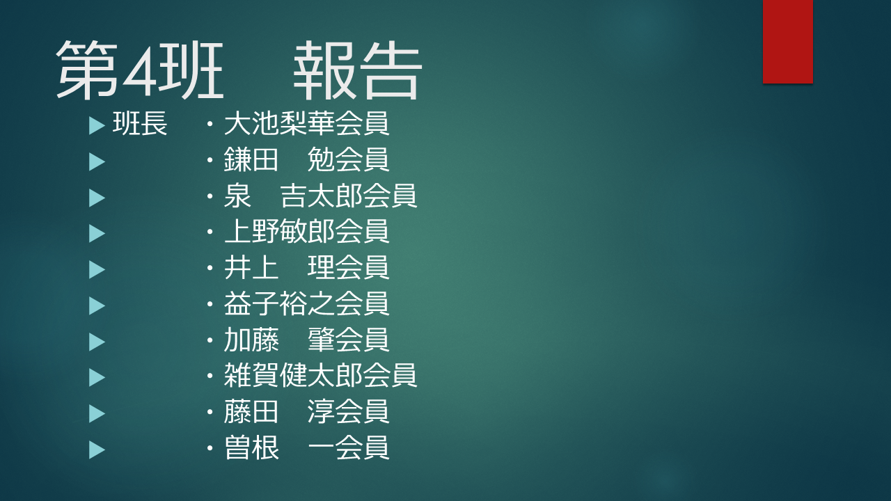 最後に急な例会プログラムの変更で、情報集会の発表が本日になってしまい各班の発表者にはご迷惑おかけいたしましたが、宜しくお願い致します。