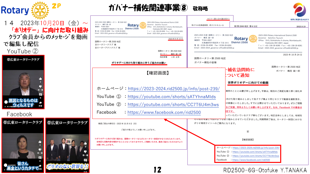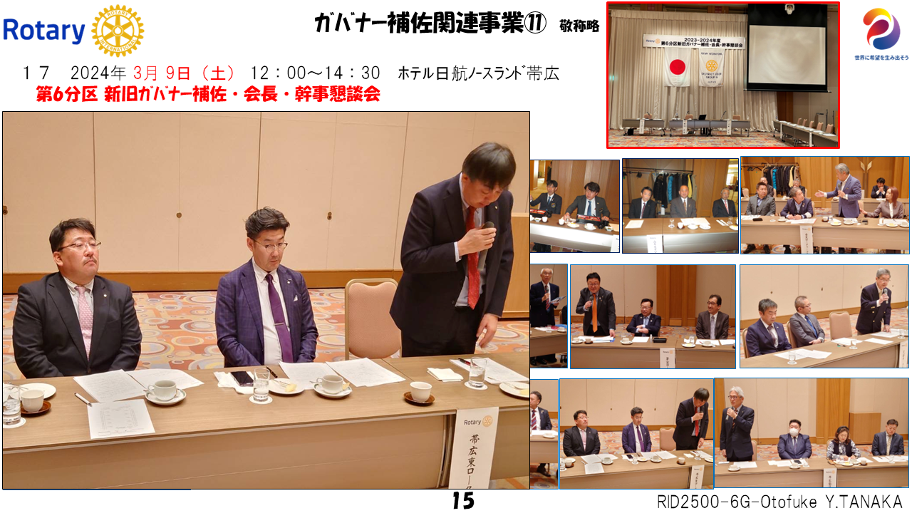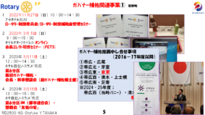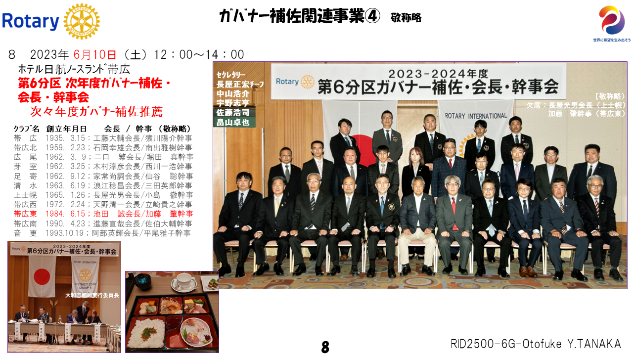 私は本来スライドを作成するのが好きなものですから、今回最後の機会ということでスライドを使って話をさせていただきます。第6分区はローターアクトクラブを含めて12クラブございます。また、帯広北ロータリークラブがホストとして帯広大谷高校のボランティア部をインターアクトクラブとして登録しています。RI第2500地区の会員数は2,223名となっており、第6分区の会員数は489名と一番多い分区となっています。私のガバナー補佐としての方針は、ガバナーおよび地区委員会と11クラブのパイプ役として誠心誠意務めます、「元気なクラブづくりのために」クラブの自主性を尊重し、クラブ会長・幹事とともに考え、活動して参りたいと思いますということを書かせていただきました。ガバナー補佐関連事業ということで時系列で資料をまとめておりますので、ご覧いただきたいと思います。その中で、ガバナー補佐推薦申し合わせ事項というものがありまして、5年後には帯広東クラブへ順番が回る予定ですので、よろしくお願いしたいと思います。また、今年度から各クラブのクラブ協議会へガバナー補佐が参加することになり、色々と調整いただきましてありがとうございました。また、ポリオデーに向けて各クラブから動画配信をお願いしたところ、東クラブからは3つの動画を配信いただきまして本当にありがとうございました。また、先日開催されたIMでは東クラブ池田会長よりコホストクラブとしてのご挨拶をいただきありがとうございました。また、先日十勝ロータリー奨学会奨学金授与式にガバナー補佐として初めて参加させていただきました。今後、十勝全体で奨学金の活動を拡げていくという趣旨があり、私も賛同させていただく意味で参加させていただきました。また、来月6月15日には東クラブの40周年記念式典・祝賀会が開催されます。祝賀会の締めの挨拶のご依頼を受けさせていただきますが、私はお酒が好きなものですからできれば締めではない方がよかったのです。また、東クラブの40周年記念事業である帯広まちなか案内板に関する記事も紹介させていただきます。